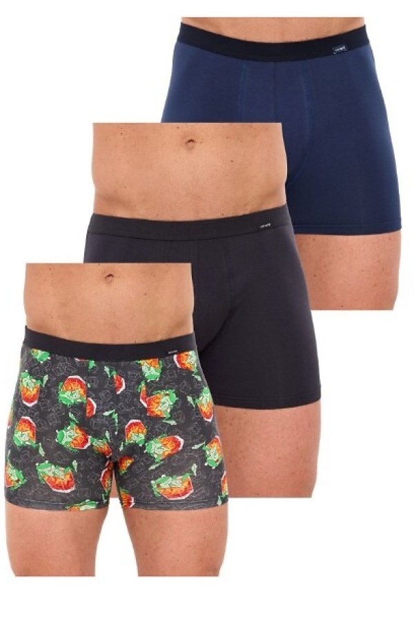 Boxeri pentru barbati realizati din bumbac de inalta calitate cu adaos de fibre elastice. In pret sunt incluse 3 bucati: una grafit uni, una bleumarin uni cu talie in nuanta contrastanta si una gri cu model deosebit cu un broscoi care se relaxeaza intr-un pahar de bautura cu gheata, toate ambalate intr-o punga de plastic.