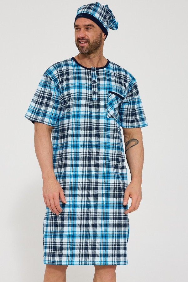 Camasa de noapte pentru barbati realizata din bumbac de inalta calitate. Camasa de noapte are maneca scurta, decolteu rotund ce se fixeaza cu nasturi, este prevazuta in zona pieptului cu un buzunar si prezinta model cu carouri. Boneta este inclusa in pret.