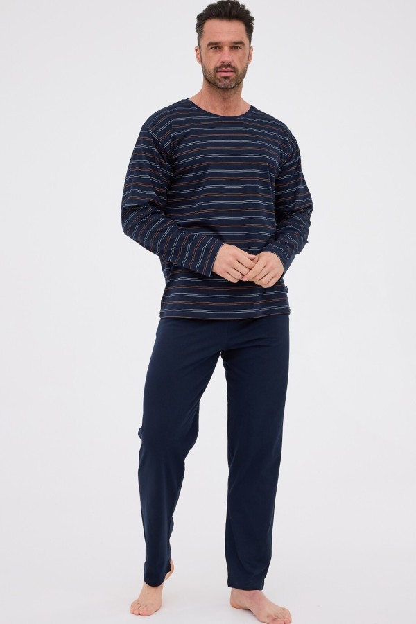 Pijama pentru barbati realizata din bumbac de inalta calitate, compusa din 2 piese. Bluza are maneca lunga, decolteu rotund finisat cu insertie de material in nuanta pantalonului si prezinta model deosebit cu dungi colorate, iar pantalonul este lung, uni.