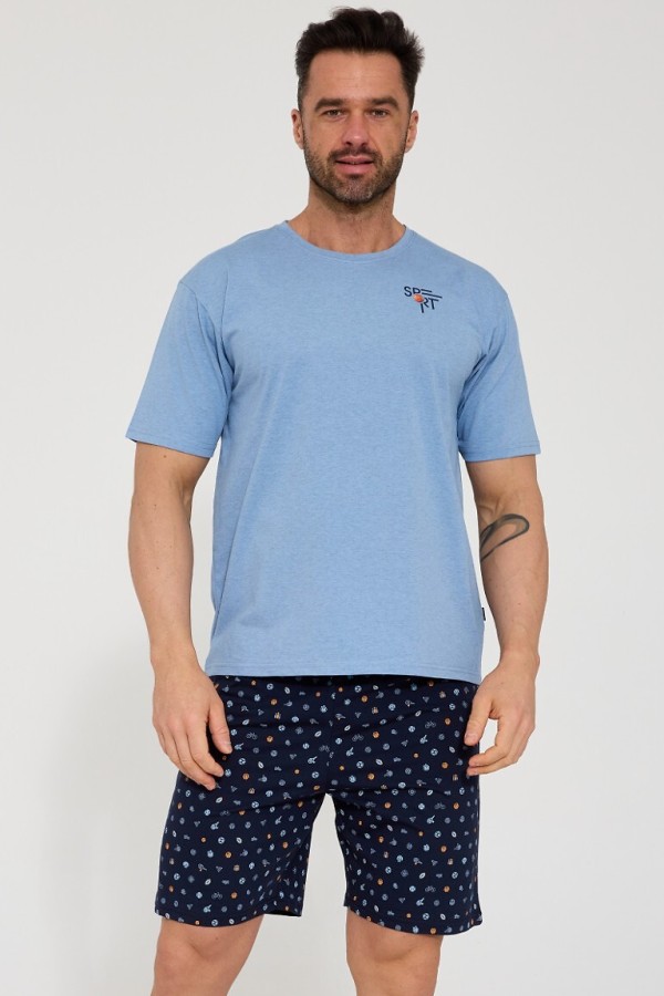 Pijama pentru barbati realizata din bumbac de inalta calitate. Pijamaua este compusa din 2 piese. Bluza este confectionata din tesatura melanj, are maneca scurta, decolteu rotund si este infrumusetata in zona pieptului cu un imprimeu cu o minge de baschet, precum si cu inscriptia "Sport", iar pantalonul este scurt, are talie elastica confortabila si prezinta model deosebit cu tematica sportiva.
