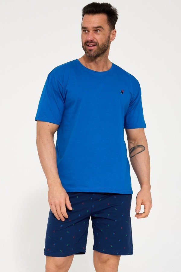 Pijama pentru barbati realizata din bumbac de inalta calitate. Pijamaua este compusa din 2 piese. Bluza are maneca scurta, decolteu rotund si este infrumusetata in zona pieptului cu un imprimeu mic cu o pasare tucan, iar pantalonul este scurt, are talie elastica confortabila si prezinta model colorat cu pasari tucan.