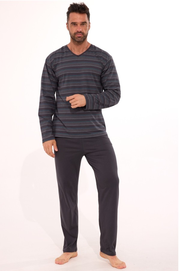 Pijama pentru barbati realizata din bumbac de inalta calitate, compusa din 2 piese. Bluza are maneca lunga, decolteu in V finisat cu insertie de material in nuanta pantalonului si prezinta model cu dungi orizontale colorate, iar pantalonul este lung, uni.