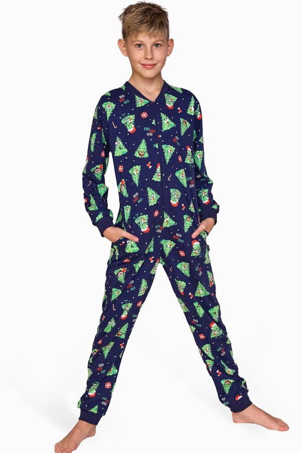 Pijama pentru baieti tip salopeta din gama "Family" realizata din bumbac de inalta calitate, o alegere ideala pentru a sublinia magia si frumusetea atmosferei de Craciun. Pijamaua are maneca lunga si pantalon lung finisate cu mansete, prezinta model festiv cu brazi, se inchide pe partea frontala cu fermoar si este prevazuta cu buzunare la nivelul soldurilor.