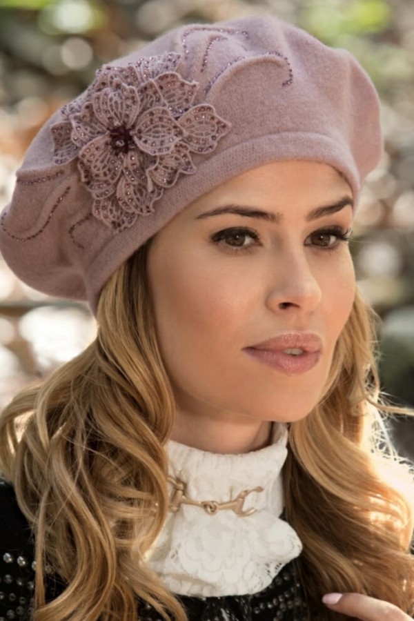 Caciula de dama tip bereta eleganta WL10091 impresioneaza prin decorul floral stilizat din dantela care este completat cu strasuri si margele asortate. Bereta ofera confort termic in zilele racoroase de toamna/iarna. Modelul atrage admiratia celor din jur si se simte bine in timpul purtarii.