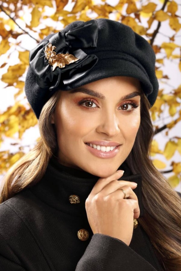 Caciula de dama tip bereta eleganta cu cozoroc WL11222 este accesorizata in lateral cu o fundita satinata completata cu o brosa. Designul tip bereta ofera o nota tinereasca look-ului pe care il desavarseste. Cozorocul inteligent integrat incadreaza perfect trasaturile faciale si accentueaza frumos zona ochilor. Modelul este unul cu atitudine, iti permite sa fii puternica, eleganta si in acelasi timp feminina.