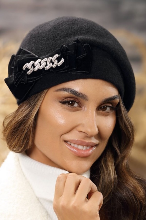 Caciula de dama tip bereta eleganta WL11262 dispune de accesorizare chic cu fundita stilizata ce are in mijloc o brosa completata cu numeroase strasuri stralucitoare. Piesa are un pliu amplu prins spre spate ce aminteste de moda frantuzeasca in care beretele erau nelipsite.