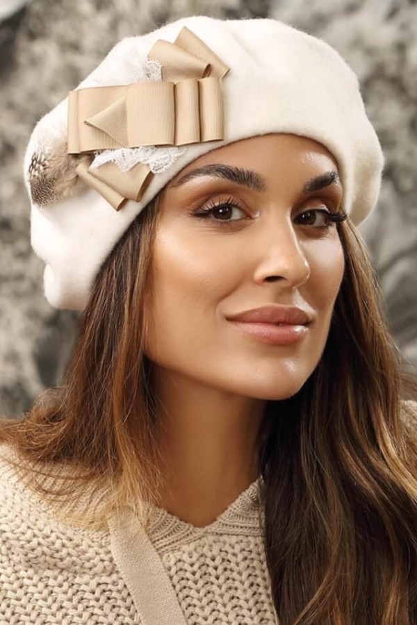 Caciula de dama tip bereta eleganta WL11266 are croi simplu care incadreaza perfect fata si pune in valoare frumusetea naturala. Accesorizarea sofisticata cu pene, dantela si fundite stilizate din benzi satinate aduce un plus de eleganta. Este un model chic care imbogateste garderobele creionate in jurul bunului gust si care nu isi pierde din farmec odata cu trecerea timpului.
