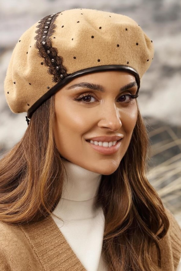Caciula de dama tip bereta eleganta WL11286 este o piesa indrazneata care pune in valoare feminitatea. Accesorizarea cu banda din catifea, tinte decorative si strasuri contrastante imprima o nota pretioasa. Piesa poate fi purtata cu aceeasi lejeritate atat de tinere cosmopolite, cat si de femei mature care indragesc aspectul premium.