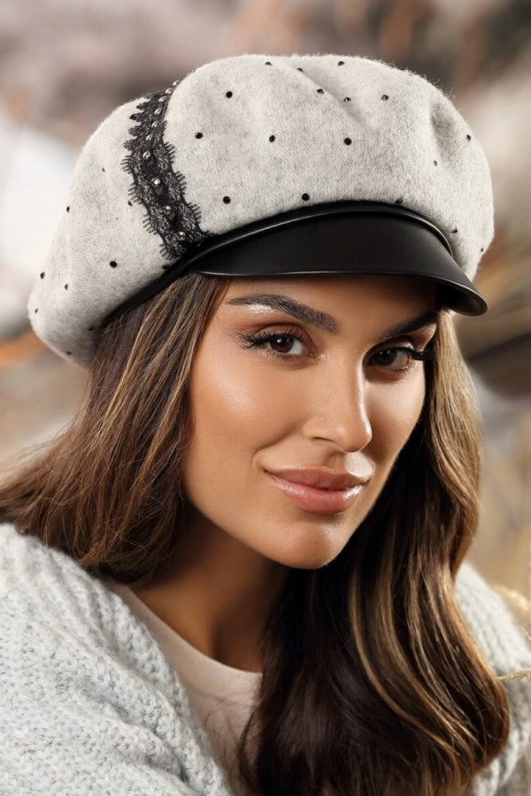 Caciula de dama tip bereta cu cozoroc WL11287 este un accesoriu vestimentar elegant care pune in valoare tinutele indraznete cu personalitate. In lateral este decorata cu o banda din dantela ce este completata cu tinte decorative. Aplicatia bogata de strasuri contrastante irizeaza in razele de lumina. Este realizata din lana pura merinos cu certificare Woolmark si indeplineste cele mai inalte standarde de calitate. Modelul se simte placut la atingere, are versatilitate ridicata si pune in valoare orice tinuta cosmopolita.