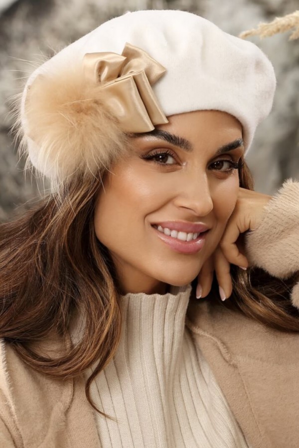 Caciula de dama tip bereta eleganta WL11288 are croi distins, romantic pus in valoare de linii simple si delicate menite sa evidentieze frumusetea, inocenta si feminitatea. Piesa atrage prin accesorizarea bogata cu fundita satinata completata cu pufi din blanita naturala. Designul de inspiratie pariziana este un alt detaliu care sporeste farmecul acestei berete ce poate fi purtata lejeritate de femeile de orice varsta