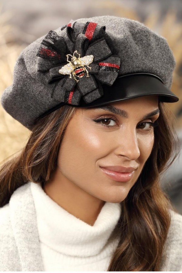 Caciula de dama tip bereta eleganta cu cozoroc WL11296 are marginea finisata cu piele ecologica in interiorul careia se regaseste un snur ce permite intr-o mica masura ajustarea. In lateral este accesorizata cu fundite stilizate, brosa sub forma de insecta, perle si strasuri in doua culori (negru, rosu). Este usor de purtat si poate fi abordata atat de doamne matura, cat si de tinere care doresc sa aduca un plus de eleganta in garderoba.