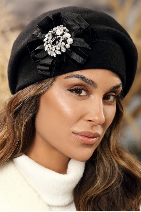 Caciula de dama tip bereta eleganta WL11310 este o piesa chic care completeaza perfect garderoba din sezonul rece. Are un pliu amplu prins spre spate, iar in lateral este accesorizata cu fundite stilizate din panglici satinate si catifea. Brosa cu perle, strasuri si cristale imbogateste aspectul premium. Acest model aminteste de moda frantuzeasca in care berete erau nelipsite.