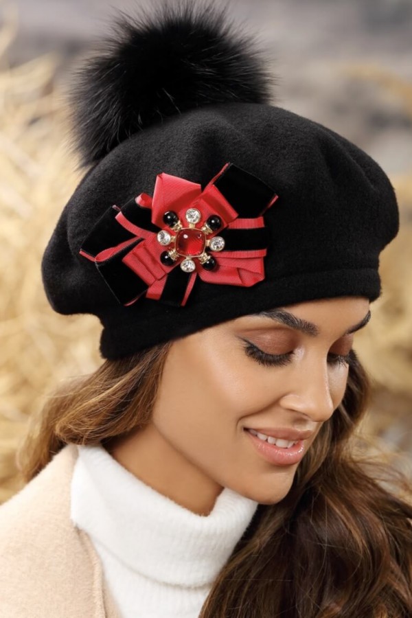 Caciula de dama tip bereta cu pompon din blanita WL11375 este o piesa premium care cucereste prin pomponul din blanita naturala. Acesta este detasabil pentru a ajuta la o curatare mai rapida. In lateral dispune de accesorizare eleganta cu fundita stilizata in doua culori completata cu o brosa ce contine cristale contrastante. Croiul tip bereta permite fixarea perfecta si evidentiaza placut trasaturile feminine.