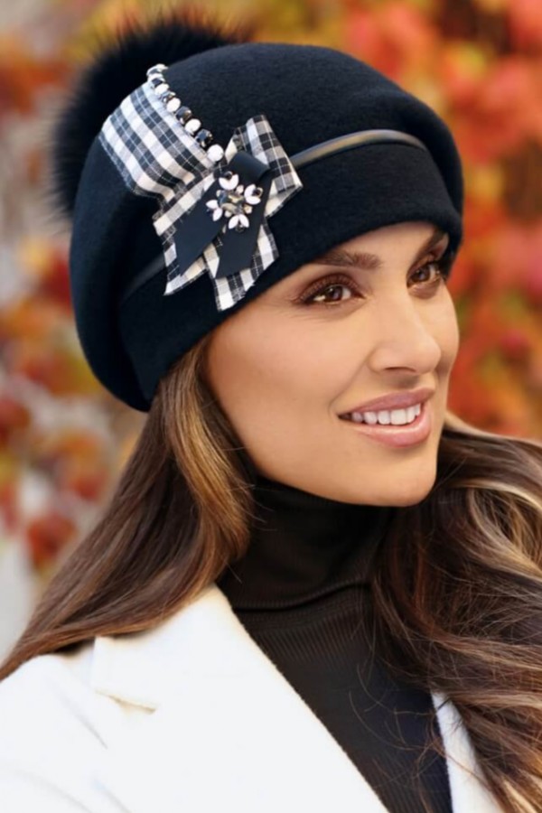Caciula de dama tip bereta cu pompon din blanita WL11412 este un accesoriu vestimentar modern care atrage priviri admirative datorita pomponului supradimensionat din blanita naturala. Acesta este detasabil pentru a face curatarea mai simpla. Piesa prezinta un pliu amplu prins spre spate, iar in lateral este decorata cu carouri, piele ecologica, strasuri si fundita stilizata.