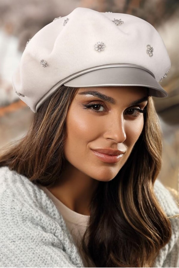 Caciula de dama tip bereta cu cozoroc WL11416 este captusita cu polar (fleece) moale, calduros care ofera confort termic ridicat chiar si in serile geroase de iarna. Piesa este accesorizata cu o bogata aplicatie de cristale ce sunt dispuse sub forma de flori. Modelul a fost conceput pentru doamnele care apreciaza stilul clasic, atemporal, si isi doresc un accesoriu practic si cochet pentru sezonul rece.