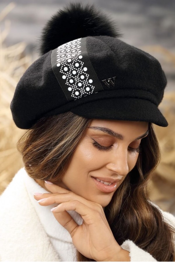 Caciula de dama tip bereta cu cozoroc si pompon WL11421 este un model deosebit care atrage privirile admirative ale celor din jur. Elementul principal este pomponul supradimensionat din blanita naturala care se poate detasa in timpul curatrii. Cozorocul inteligent introdus ofera un aer misterios, in timp ce croiul tip bereta permite incadrarea placuta a fetei. In lateral este decorata cu o banda decorativa si initiala WILLI.