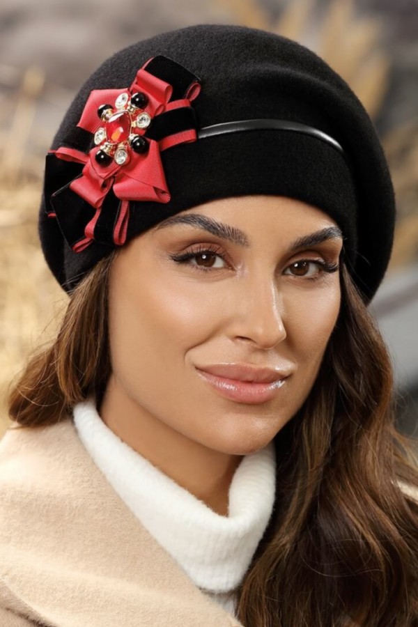 Caciula de dama tip bereta eleganta WL11431 este un model premium care cucereste prin pliul amplu prins spre spate. Dispune de accesorizare sofisticata cu fundita stilizata si brosa cu cristale contrastane. Intreg ansamblu decorativ imprima o nota rafinata. Este o piesa conceputa pentru a pune in valoare feminitatea si romantismul. Este versatila si poate fi purtata de femeile de orice varsta.