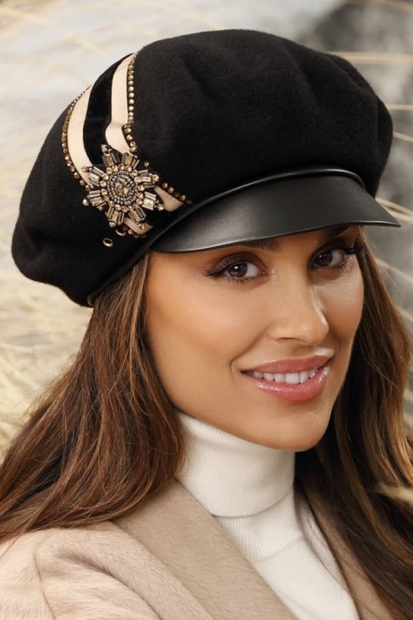 Banda decorativa ce inconjoara calota este completata cu margele, strasuri si capse, adaugand o nota de eleganta si feminitate. Cozorocul din piele ecologica protejeaza purtatoarea de razele soarelui si intemperii, conferind in acelasi timp un aer puternic si sofisticat. Materialele de inalta calitate folosite garanteaza confort si durabilitate. Lana pura de merinos este recunoscuta pentru proprietatile sale termoregulatoare, capacitatea de a pastra caldura si rezistenta la uzura. Certificarea Woolmark confirma caracteristicile superioare.