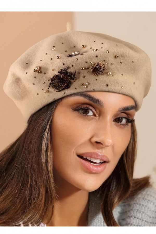 Un alt aspect definitoriu este croiul tip bereta care se potriveste oricarei forme de cap si adauga un plus de personalitate tinutei tale. Caciula de dama tip bereta eleganta WL11446 este disponibila in culoarea bej, o alegere perfecta pentru femeile cu personalitatea. Dar nu doar croiala si culoarea fac din aceasta bereta un accesoriu deosebit. Accesorizarea eleganta compusa din brose sub forma de insecte, margele si strasuri, adauga o nota glam. Insectele aduc o nota de natura si de grandoare piesei, iar strasurile si margelele adauga un plus de stralucire.