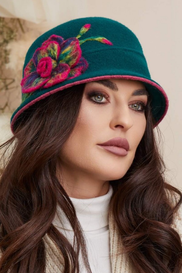 Caciula de dama stil palarie Sisi 1 se remarca prin designul modern si accesorizarea deosebita. In partea laterala este decorata cu o aplicatie florala in culori contrastante, care ofera un aer proaspat si primavaratic. Aceasta aplicatie este realizata manual, astfel incat culorile pot fi usor diferite fata de poza. De asemenea, cusatura decorativa care incercuieste calota adauga un plus de eleganta si originalitate intregii piese.