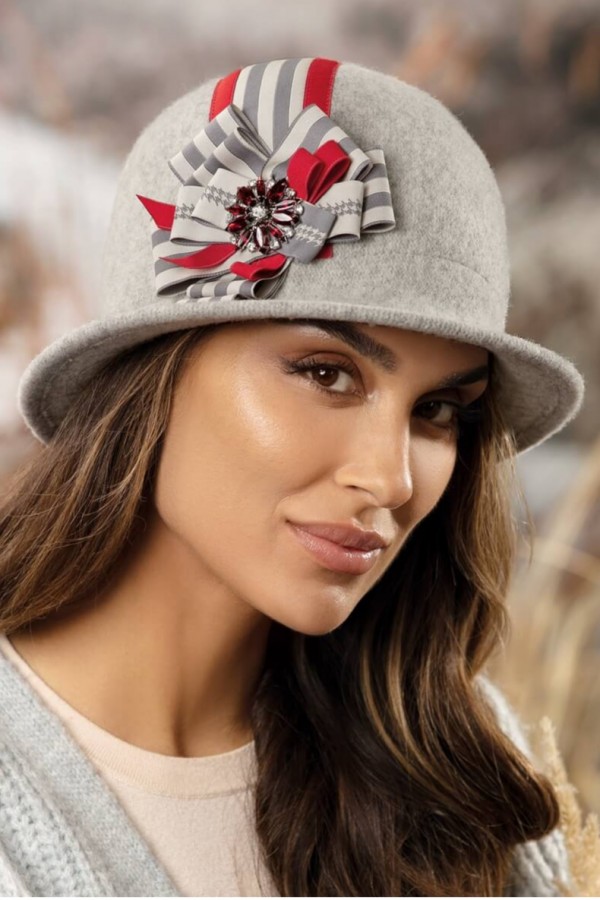 Caciula de dama stil palarie WL11284 este pe cat de practica, pe atat de eleganta. Atrage atentia prin accesorizarea laterala cu fundita stilizata ce are in mijloc o brosa fermecatoare cu cristale si strasuri. Banda decorativa in trei culori imbogateste intregul decor. Este un model atemporal, ce nu se demodeaza si se potriveste doamnelor de orice varsta