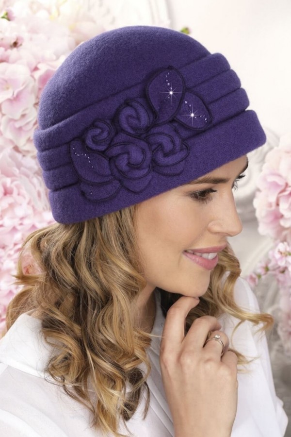 Caciula de dama WL10386 are un design aparte dominat de accente puternice si linii clasice. Croiala permite caciulii sa ia forma capului, imbracandu-l frumos si protejandu-l de intemperii in sezonul de toamna-iarna. In partea inferioara se evidentiaza bordura supradimensionata realizata cu ajutorul pliurilor decorative pronuntate. Aspectul cochet al modelului este amplificat de aplicatia de inspiratie florala integrata in lateral. Marginile acesteia sunt bine accentuate datorita tivului contrastant iar strasurile irizeaza discret in razele de lumina.