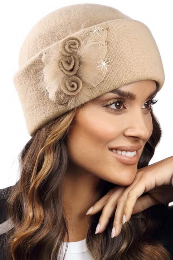 Caciula eleganta de dama WL10989 este un accesoriu vestimentar atractiv care completeaza cu succes o varietate de tinute si stiluri. Designul rafinat si detaliile impresionante o fac sa iasa in evidenta in randul accesoriilor de toamna-iarna, oferind purtatoarei un look inconfundabil. Bordura lata si trandafirii stilizati reprezinta elementele distinctive. Acesti trandafiri sunt completati de insertii de pufi din blanita naturala si strasuri asortate, care adauga un plus de stralucire modelului. Acest design complex si bine gandit reflecta atentia la detalii.
