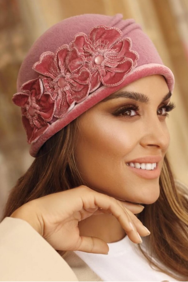 Caciula eleganta de dama WL11137 este o piesa cocheta care aduce sarm in garderoba si contribuie la desavarsirea unor tinute inedite. Modelul se evidentiaza datorita rafinamentului creat prin accesorizarea fina si designul distins. Are marginea tubulara imbracata in catifea, iar in lateral este accesorizata cu trei flori stilizate ce au in mijloc cate o margeluta asortata. Pe calota prezinta pliuri decorative care imbogatesc aspectul premium.
