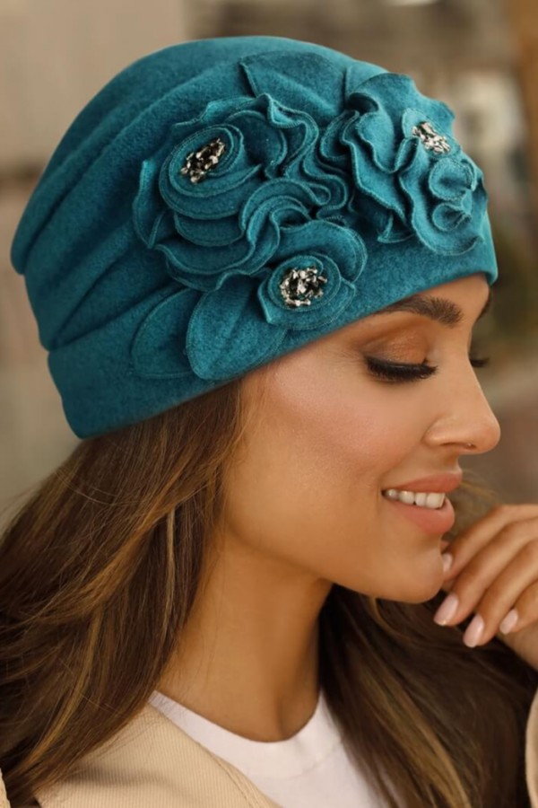 Caciula eleganta de dama WL11142 are design aparte dat de pliurile decorative prinse la spate sub o aplicatie de margele. Este un model versatil care ofera stare de bine in timpul purtarii. Dispune de accesorizare chic cu aplicatii florale completate cu margele contrastante. Este un accesoriu vestimentar indraznet care iti permite sa realizezi tinute rafinate cu accente romantice chiar si in sezonul rece de toamna-iarna.