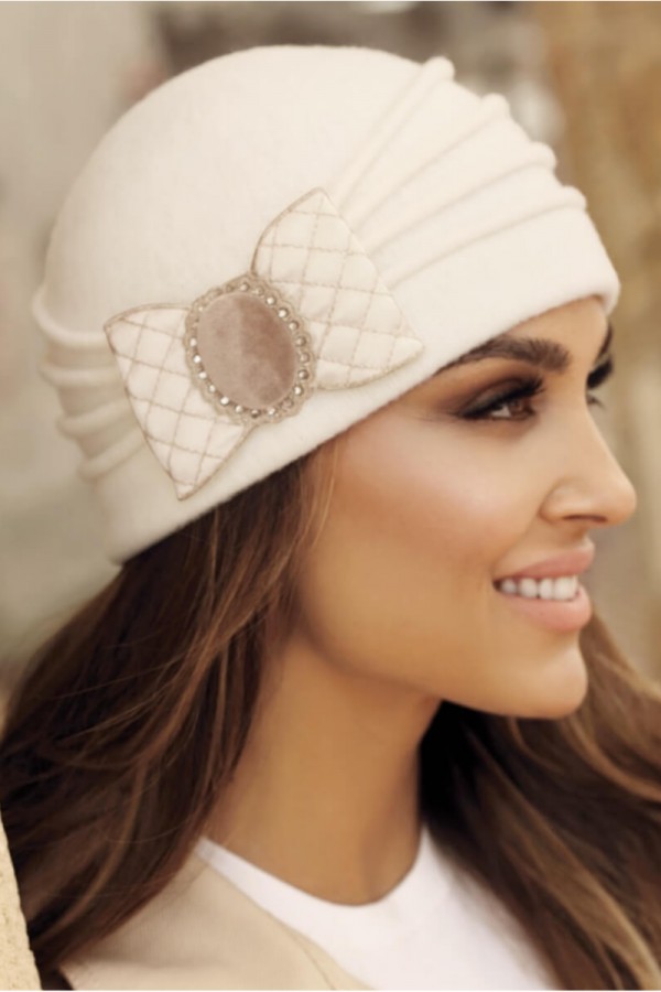 Caciula eleganta de dama WL11150 face parte din colectia premium. Dispune de un decor chic ce poate fi purtat in lateral sau in spate. Fundita stilizata din satin prezinta cusaturi cu fir lame si o aplicatie de catifea inconjurata de strasuri asortate. Designul sarmant este dat si de pliurile decorative de pe calota. Este o piesa sofisticata creata pentru a completa garderobele doamnelor distinse.