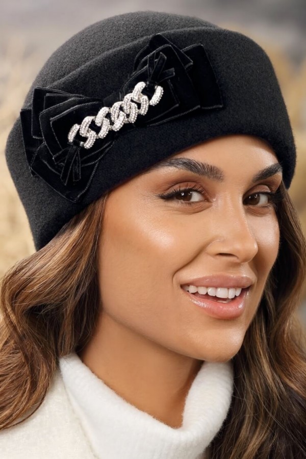 Caciula eleganta de dama WL11278 ofera eleganta si rafinament tinutelor pe care le completeaza. Cucereste prin bordura dubla care este decorata cu fudite stilizate din catifea in mijlocul carora este o brosa completata cu o bogata aplicatie de strasuri stralucitoare.