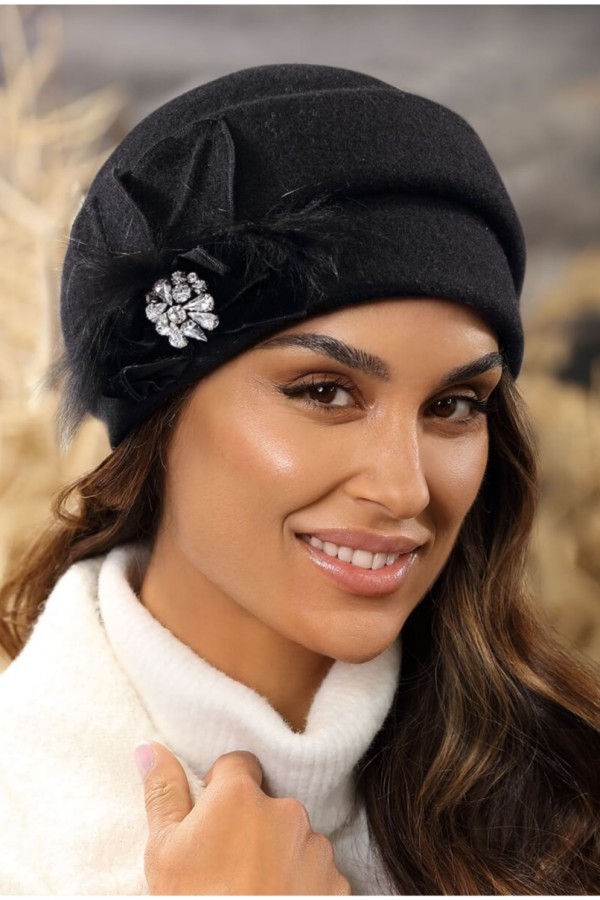 Caciula eleganta de dama WL11292 este un accesoriu vestimentar care ofera stil tinutelor pe care le completeaza. Se evidentiaza datorita materialelor de foarte buna calitate, finisajelor perfect executate si accesorizarii sofisticate. Modelul este decorat in lateral cu pufi din blanita naturala, brosa fermecatoare, strasuri si cristale ce stralucesc discret. Pliul amplu completeaza intreg decorul.