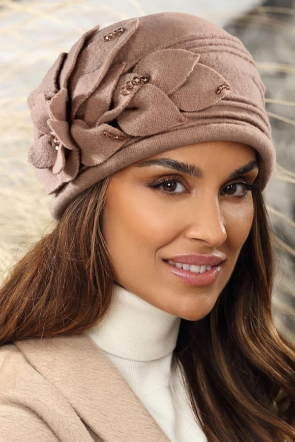 Caciula eleganta de dama WL11301 atrage prin accesorizarea cu aplicatii florale, strasuri asortate si cusaturi decorative. Modelul are finisaje impecabile, se simte moale si poate fi purtata cu placere in orice imprejurare. Nu este captusita, insa tricotul din care este confectionata asigura confort termic ridicat. Lana utilizata pentru realizarea acesteia provine de la oile din rasa merinos si are certificare de calitate Woolmark.
