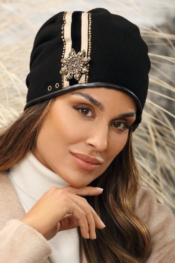 Caciula eleganta de dama WL11331 are design modern dat de pliurile decorative prinse la spate. Marginea finisata cu piele ecologica ascunde un snur ce permite intr-o mica masura ajustarea. In lateral este accesorizata cu banda decorativa in doua culori, capse, strasuri stralucitoare si margele. Este piesa care pune in valoare personalitatea puternica, caracterul independent si aerul sofisticat.
