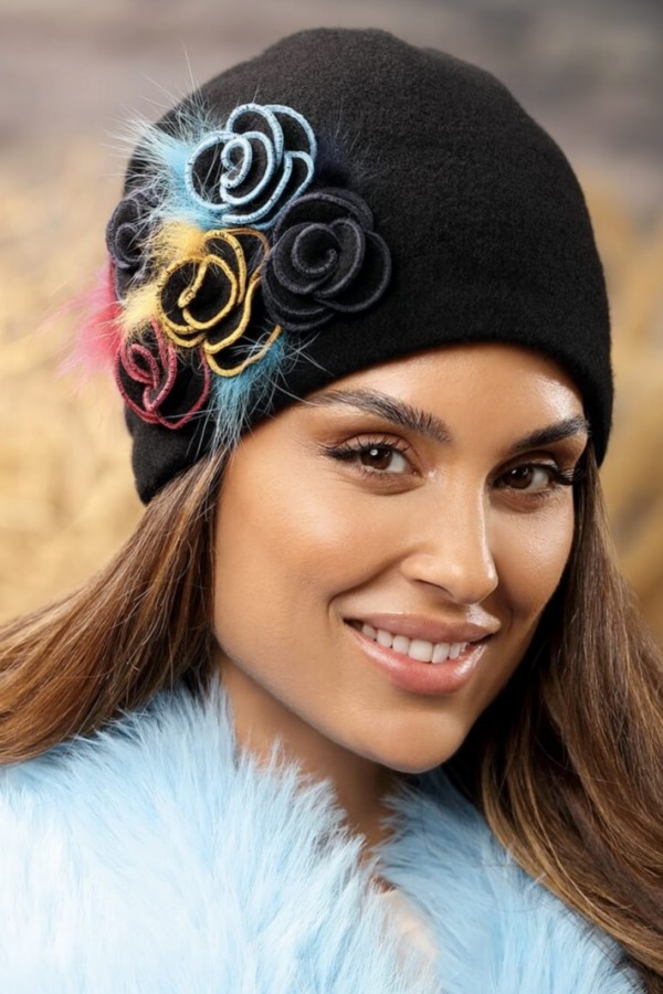 Caciula de dama WL11335 ofera confort sporit si stare de bine in timpul purtarii. Are croi simplu echilibrat de pliurile decorative prinse la spate. Piesa impresioneaza prin accesorizarea contrastanta cu trandafiri stilizati completati cu pufi din blaita naturala. Acest model se adreseaza doamnelor care apreciaza stilul clasic, atemporal si isi doresc un accesoriu practic si elegant pentru sezonul rece.