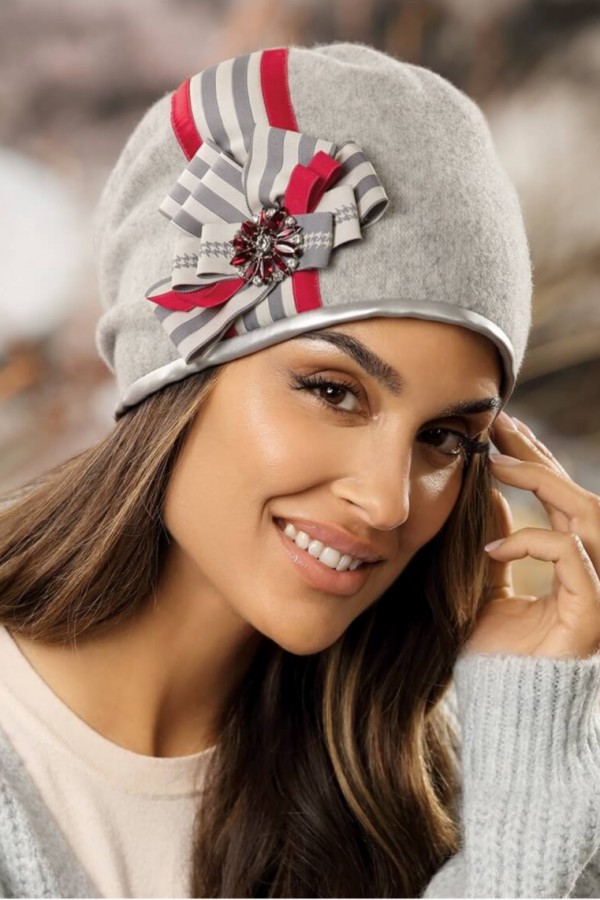 Caciula eleganta de dama WL11336 este un accesoriu vestimentar chic care ofera rafinament garderobei pe care o completeaza. Piesa este una versatila si poate completa cu usurinta orice tinuta. Are desig modern dat de pliurile prinse la spate si dispune de accesorizare eleganta cu fundite stilizate, brosa, banda decorativa, cristale si strasuri. Marginea finisata cu piele ecologica ascunde un snur ce permite intr-o mica masura ajustarea.