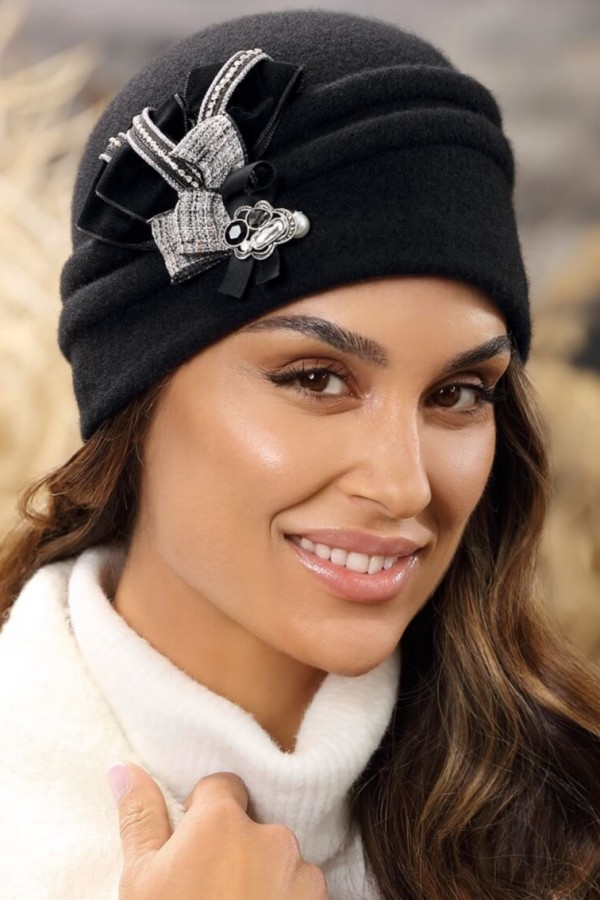 Caciula eleganta de dama WL11404 este un accesoriu vestimentar sofisticat care ofera rafinament tinutelor pe care le completeaza. Dispune de accesorizare chic cu fundite stilizate, strasuri, cristale, perle si brosa. Piesa are design modern dat de cele doua pliuri decorative care incercuiesc calota. Modelul pune in valoare personalitatile romantice, puternice, si moderne.