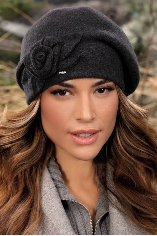 Decoratiunea integrata in lateral sub forma unui trandafir cu frunze are aspect natural si completeaza perfect bereta. Sub acest ornament este cusuta o placuta discreta cu sigla Willi. La spate este prevazuta cu o mica banda elastica mascata in bordura ce permite beretei sa se fixeze perfect pe cap. Caciula de dama tip bereta WL11641 are atat rolul de a proteja capul in zilele cu temperaturi scazute cat si de a adauga farmec tinutelor vestimentare de zi cu zi.