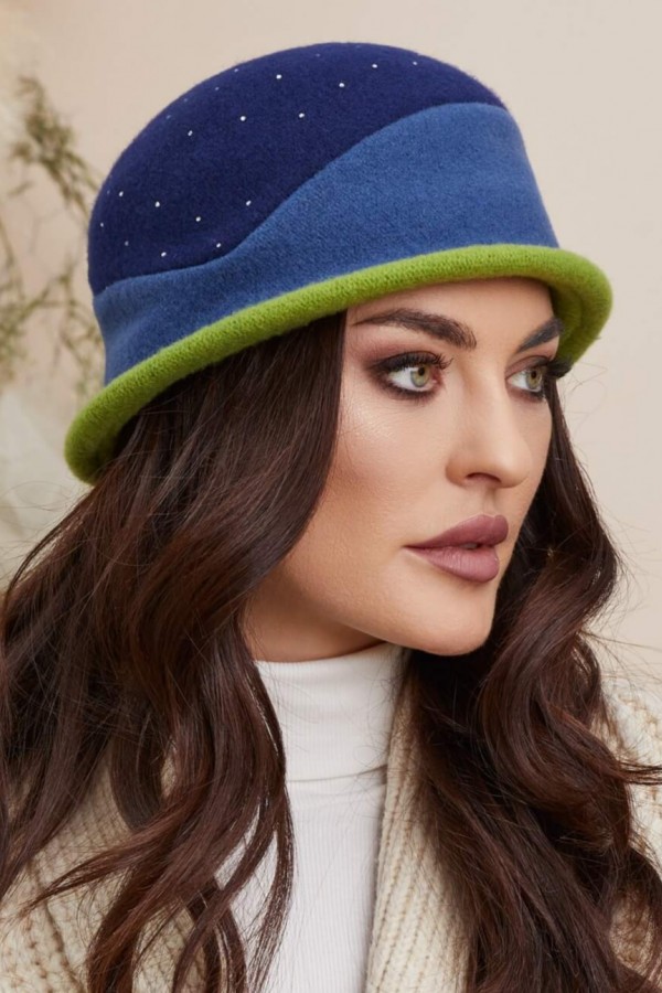 Este o piesa vestimentara care aduce sarm in garderoba si contribuie la desavarsirea unor tinute usor de remarcat. Calota este realizata in doua culori (bleumarin, albastru) si este accesorizata cu mici strasuri ce stralucesc discret in razele de lumina. Borul mic incadreaza perfect trasaturile faciale si are o nuanta placuta de verde. Caciula de dama stil palarie Julia are in interior o banda elastica care permite asezarea perfecta pe cap. A fost conceputa pentru femeile care iubesc sa adopte un stil vestimentar modern si confortabil.