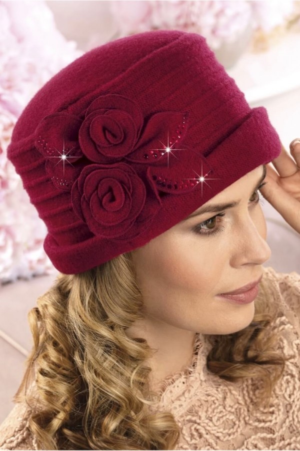 Caciula eleganta de dama WL10708 este inspirata din moda britanica, cu linii clasice si accente pline de rafinament. Marginea usor asimetrica si intoarsa asigura volum in partea inferioara si permite incadrarea perfecta a trasaturilor faciale. Cusaturile decorative ce urca pe calota amplifica nota chic a modelului si completeaza perfect ansamblul ornamental integrat in lateral. Acesta se prezinta sub forma a doua flori stilizate ale caror frunze sunt imbogatite cu mici strasuri ce irizeaza discret in razele de lumina.