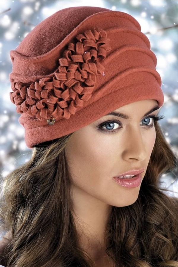 Caciula de dama WL10636 nu poate trece neobservata, fiind fiind un model spectaculos si extrem de feminin. Impresioneza atat prin accesorizarea deosebita din lateral cat si prin pliurile decorative ondulate. Decorul principal este reprezentat de aplicatia bogata de panglici spiralate din tricot in mijlocul careia se gasesc strasuri discrete. Este confectionata din lana merinos de calitate superioara, certificata Woolmark, ce nu creeaza disconfort la purtare. Caciula WL10636 are atat rol practic, protejandu-va capul de temperaturile scazute, cat si de a adauga farmec tinutelor de zi cu zi. Infrunta iarna cu vestimentatii stylish completate cu o caciula pe masura!