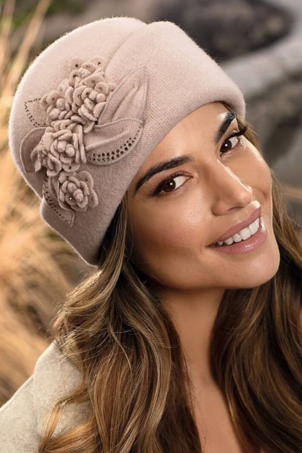 Designul este unul chic, creat pentru a accentua frumusetea si a evidentia trasaturile faciale. Se remarca bordura lata asimetrica ce adauga volum in partea inferioara. In lateral este imbogatita cu elemente florale deosebite stilizate din tricot. Manunchiul de flori mici si frunze are aspect natural si este completat cu strasuri asortate ce irizeaza discret in lumina. Aceste detalii transforma caciula eleganta de dama WL11520 intr-o piesa cu personalitate care pune in valoare caracterele romantice.
