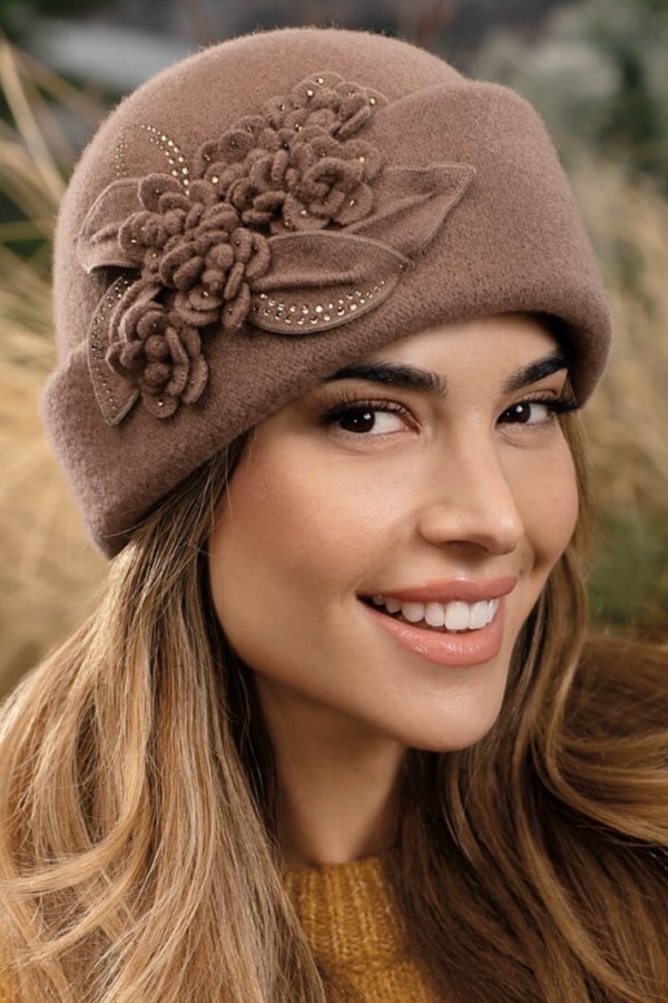 Designul este unul chic, creat pentru a accentua frumusetea si a evidentia trasaturile faciale. Se remarca bordura lata asimetrica ce adauga volum in partea inferioara. In lateral este imbogatita cu elemente florale deosebite stilizate din tricot. Manunchiul de flori mici si frunze are aspect natural si este completat cu strasuri asortate ce irizeaza discret in lumina. Aceste detalii transforma caciula eleganta de dama WL11522 intr-o piesa cu personalitate care pune in valoare caracterele romantice.