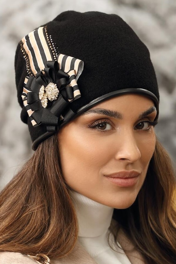 Caciula eleganta de dama WL11671 are marginea finisata cu piele ecologica si ascunde un snur care permite intr-o mica masura ajustarea, asigurandu-se astfel ca piesa va sta perfect pe capul purtatorului. Accesoriile chic aduc un plus de rafinament si feminitate. Funditele stilizate, banda decorativa in doua culori si brosa cu cristale si strasuri ce irizeaza in razele de lumina confera un aer sofisticat si premium. Aceste detalii fac din caciula eleganta de dama WL11671 o alegere perfecta pentru doamnele distinse care doresc să se diferentieze si sa se simta speciale in orice moment.