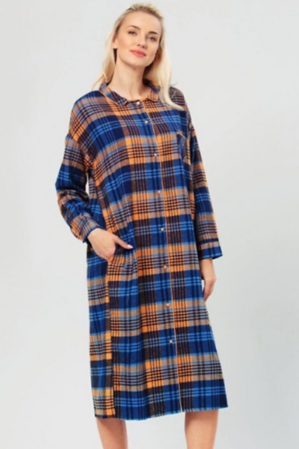 Camasa lunga de noapte realizata din flanel din bumbac de inalta calitate, placut la atingere. Camasa este usor extinsa la spate, prezinta model deosebit cu carouri, are maneca lunga, decolteu finisat cu guler, se inchide pe partea frontala cu nasturi, este prevazuta cu un buzunar mic in zona pieptului si cu buzunare laterale in zona soldurilor.