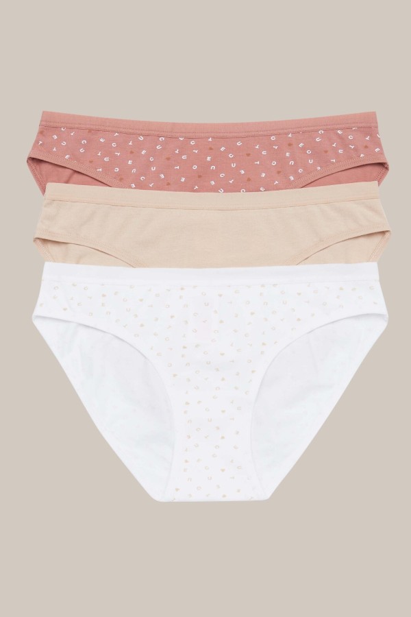 Chilot clasic de dama realizat din bumbac de inalta calitate cu adaos de fibre elastice. In pret sunt incluse 3 bucati: una bej, una ecru cu model deosebit cu litere si inimioare si alta roz pudrat cu litere si inimioare, toate ambalate intr-o punga de plastic.