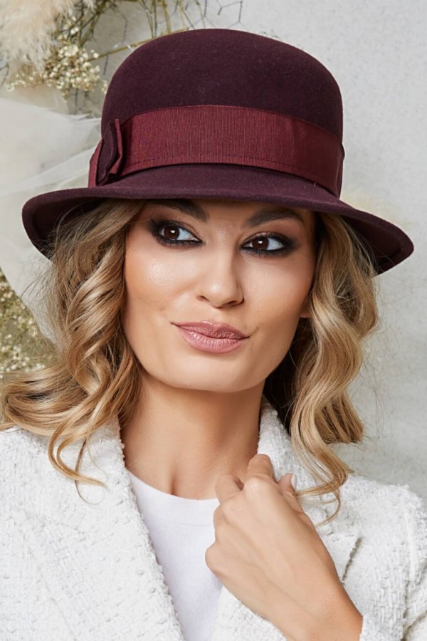 Palarie de dama Janeta 1 – trecerea de la calota la bor este pusa in evidenta printr-o banda lata ripsata, un detaliu ce adauga o nota de distinctie si rafinament. Acesta subliniaza designul atemporal, adaugand un strop de modernitate. Accesorizata in lateral, fundita stilizata din fetru impreuna cu banda ripsata, creeaza un punct focal interesant. Este acel detaliu care atrage privirea si care ofera un aer jovial si feminin intregii palarii. Calota cilindrica, in combinatie cu borul mediu discret aplecat in jos, asigura o silueta clasica si echilibrata, potrivita pentru o multitudine de forme ale fetei.