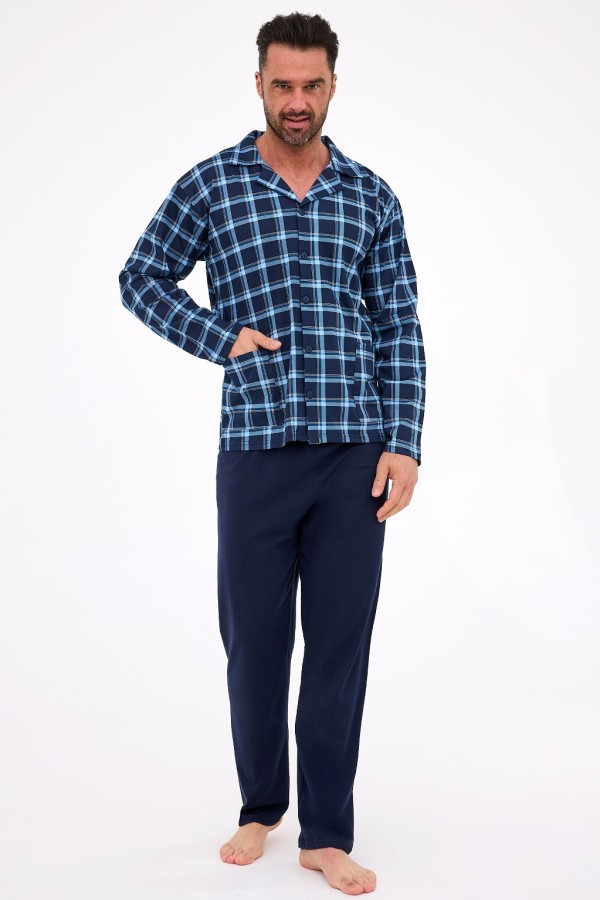 Pijama pentru barbati realizata din bumbac de inalta calitate, compusa din 2 piese. Bluza are maneca lunga, decolteu in V finisat cu guler, este prevazuta cu doua buzunare la nivelul soldurilor, prezinta model deosebit cu carouri si se inchide in fata cu nasturi, iar pantalonul este lung, uni si are talie elastica confortabila.