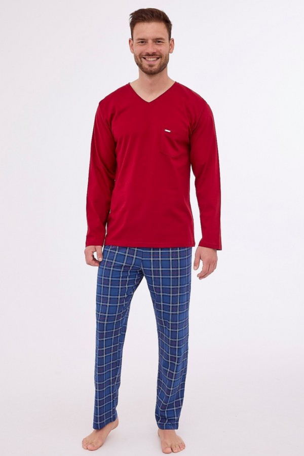 Pijama pentru barbati realizata din bumbac de inalta calitate, compusa din 2 piese. Bluza este uni, are maneca lunga, decolteu in V si este prevazuta cu un buzunar la nivelul pieptului, iar pantalonul este lung, prezinta model deosebit cu carouri si are talie elastica confortabila.