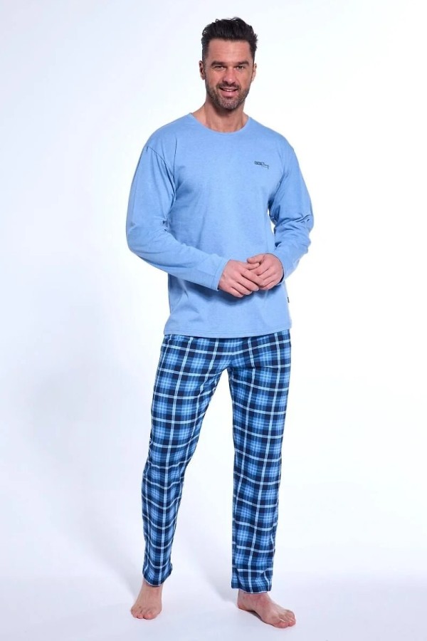Pijama pentru barbati realizata din bumbac de inalta calitate, compusa din 2 piese. Bluza este confectionata din tesatura melanj, are maneca lunga, decolteu rotund si este infrumusetata in zona pieptului cu inscriptia "Stay strong", iar pantalonul este lung, are talie elastica confortabila si prezinta model deosebit cu carouri.
